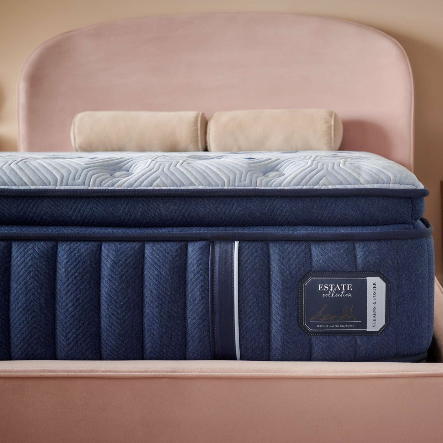 The Stearns & Foster Estate Pillow Top Queen Firm Mattress in Light Blue/Navy combines luxurious comfort with exceptional support. Featuring TEMPUR-Indulge™ Memory Foam for targeted pressure relief and exclusive IntelliCoil® innersprings for adaptive support, this euro pillow top mattress delivers a perfect balance of firmness and comfort for restful, rejuvenating sleep.