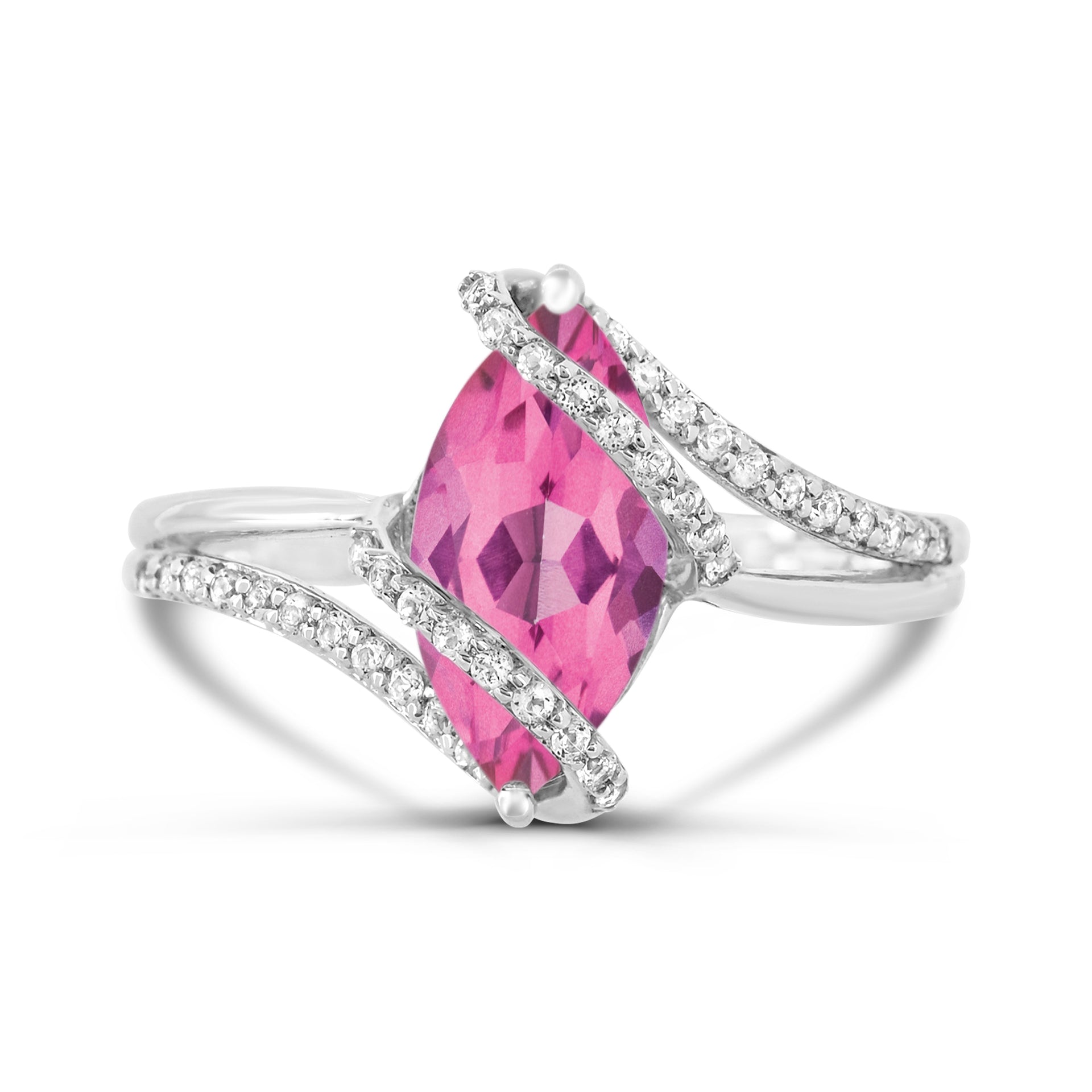 Introducing the Sterling Silver Created Pink Sapphire and White Topaz Ring, a dazzling piece from our exclusive Fashion Jewelry For Women collection. This exquisite ring captures the elegance of contrast, featuring a stunning Marquise Round-shaped Created Pink Sapphire surrounded by a halo of glistening White Topaz. The beautiful Rhodium Plated finish enhances the ring's allure, while the total weight of 2.3 carats makes it a statement piece that radiates sophistication and grace. Perfect for any occasion, this ring serves as a timeless addition to any jewelry collection, allowing you to express your unique style and elegance effortlessly.