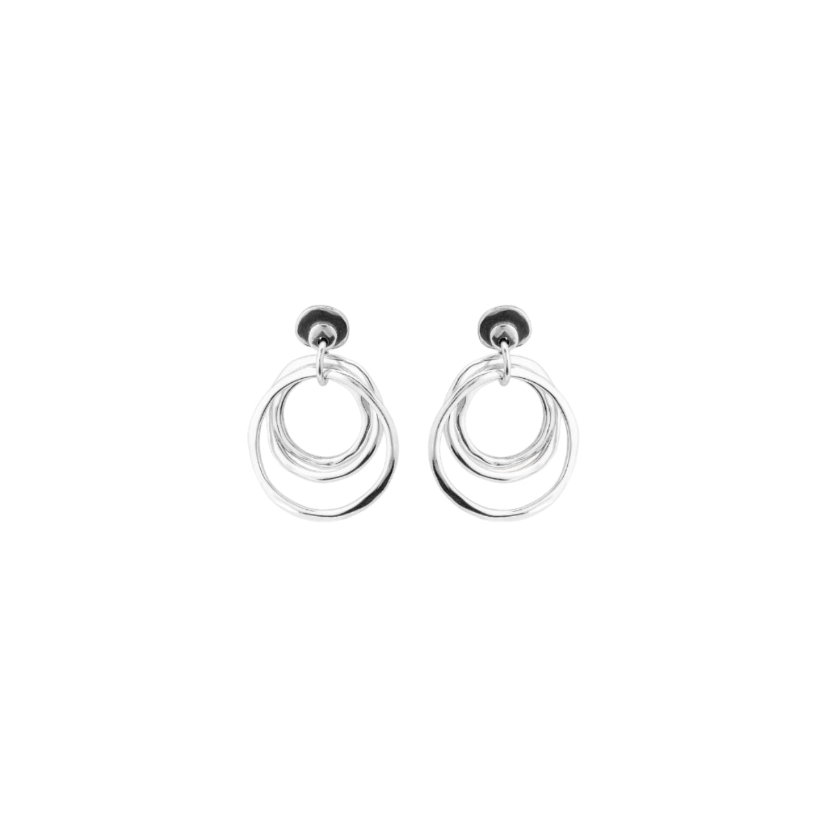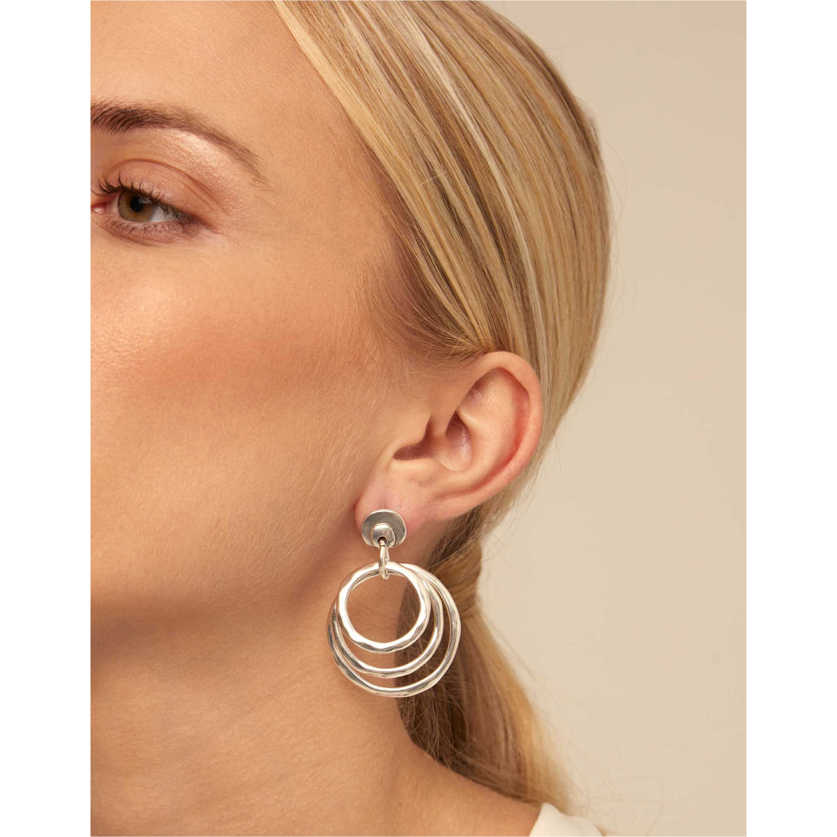 Elevate your style with sterling silver-plated earrings, featuring a striking design of three irregular and distinct hoops. Each piece reflects the unique charm of handcraftsmanship. These elegant earrings are secured with a comfortable nut clasp for all-day wear. With a sleek silver finish, they offer a bold yet refined look perfect for any occasion. A standout accessory for women who appreciate distinctive, timeless elegance.