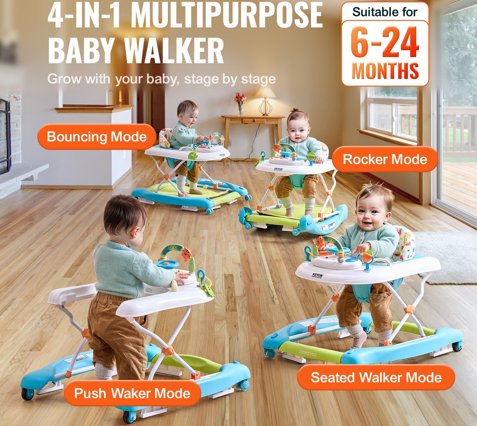 4-in-1 Baby Walker, Foldable Baby Activity Center on Wheels, 3 Adjustable Height, Music & Toys Tray, Learning-Seated | Walk-Behind | Rocker | Bouncer Toddler Walker for Girls Boys 6-24 Months