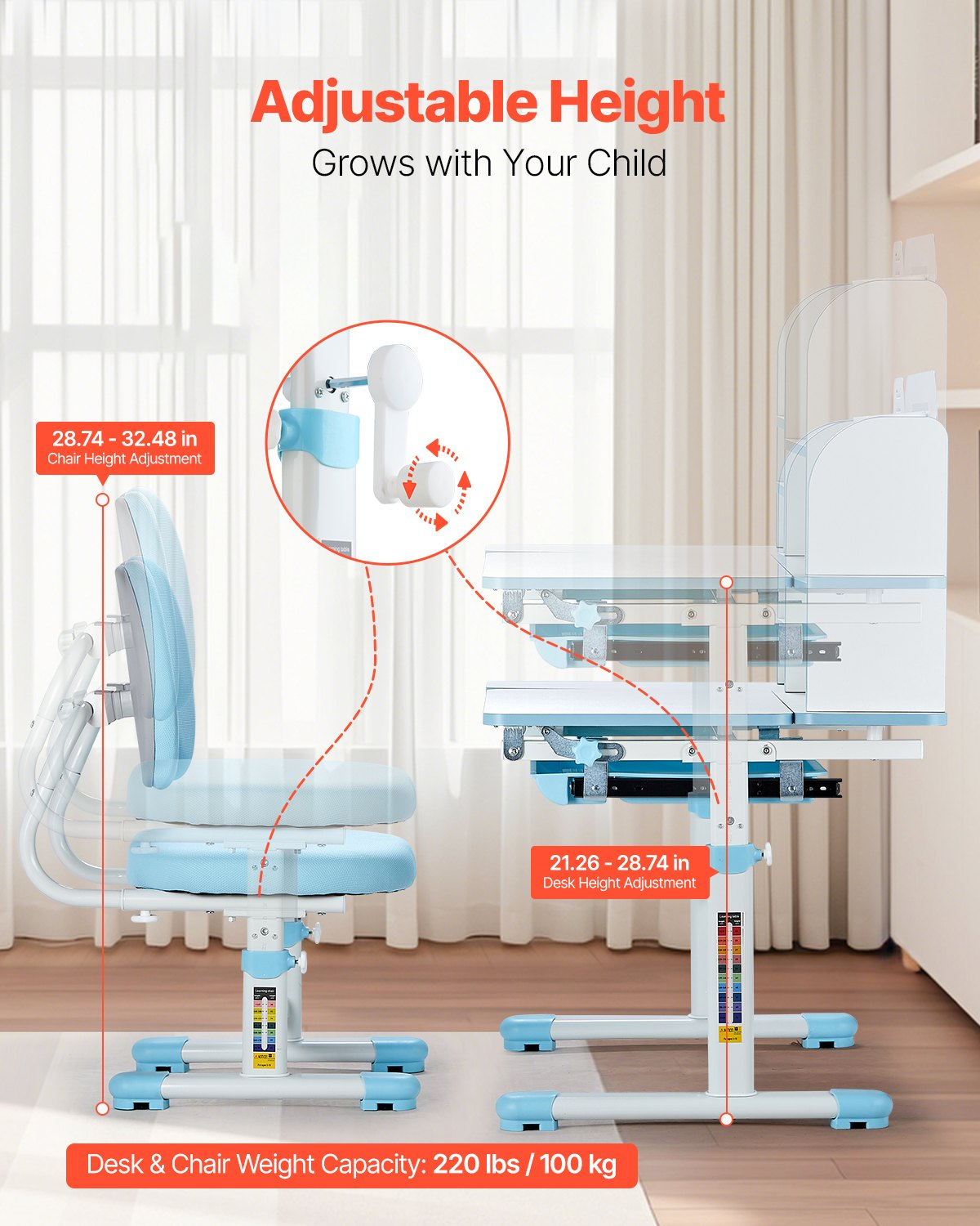 Kids Study Chair and Desk Set, Study Desk and Chair for Kids with Bookshelf & Storage Drawer, Adjustable Height & 0-40° Tilted Desktop Desk and Chair, Study Table for Bedroom & Study Room, Blue
