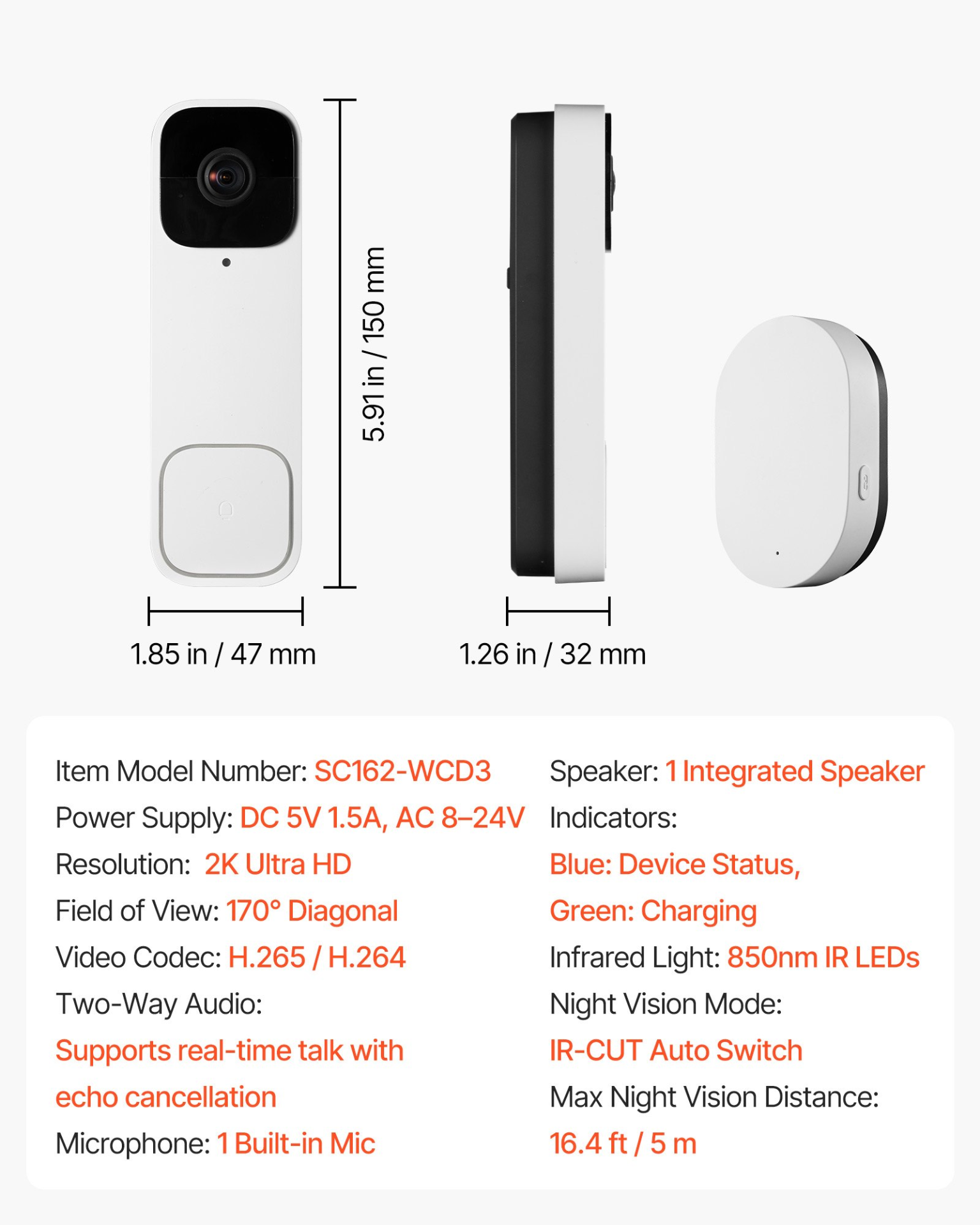Wireless: 2.4GHz Wi-Fi (IEEE 802.11 b/g/n),Indoor Chime: Multiple Ringtone, 3 Volume Levels, App-Controlled,Microphone: 1 Built-in Mic,Max Night Vision Distance: 16.4 ft / 5 m,Voice Assistant Compatibility: Amazon Alexa and Google Assistant,Color: White,Motion Detection: PIR Human Detection,Video Codec: H.265 / H.264,Dimensions: 1.85 x 1.26 x 5.91 in / 47 x 32 x 150 mm,Two-Way Audio: Supports real-time talk with echo cancellation,Infrared Light: 850nm IR LEDs,Power Supply: DC 5V 1.5A, AC 8β24V,Item Model Number: SC162-WCD3,Video Messaging: Leave and receive visitor video messages via app,Product Weight: 0.64 lbs / 0.29 kg,Quick Replies: Preset voice messages for missed interactions,Night Vision Mode: IR-CUT Auto Switch,Field of View: 170Β° Diagonal,Indicators: Blue: Device Status, Green: Charging,Storage Options: Supports up to 128GB TF Card (sold separately),Main Material: ABS Plastic,Resolution: 2K Ultra HD,Speaker: 1 Integrated Speaker
