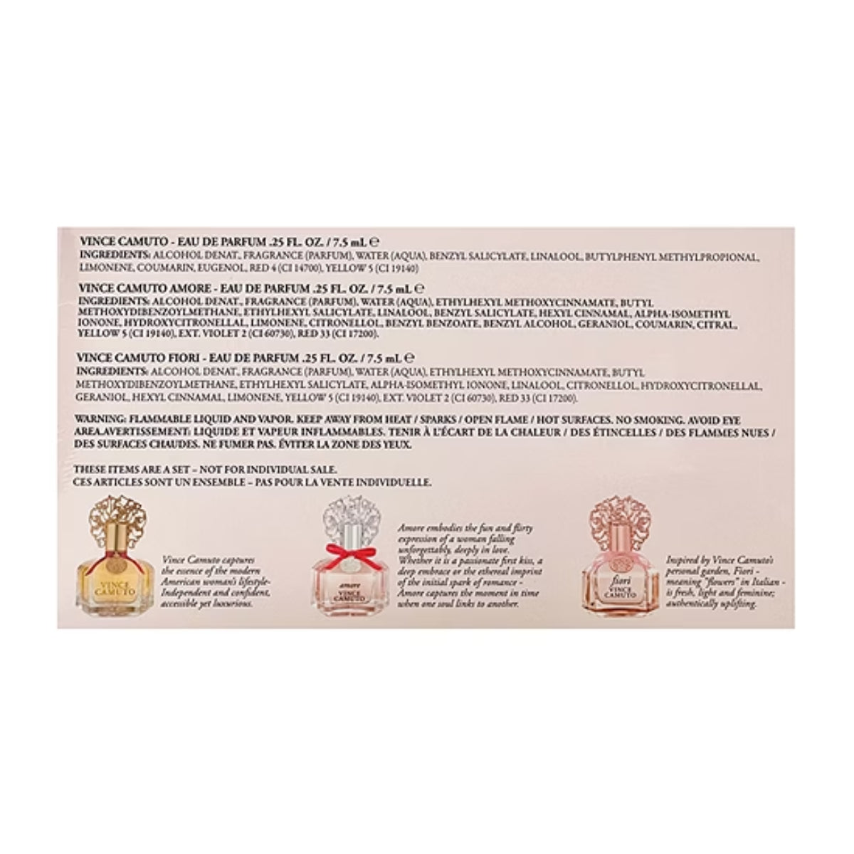 Whether you want to uplift your mood with Amore's vibrant notes, embrace the gentle beauty of Fiori, or indulge in the classic allure of Vince Camuto, this gift set provides versatility and charm in every spritz.