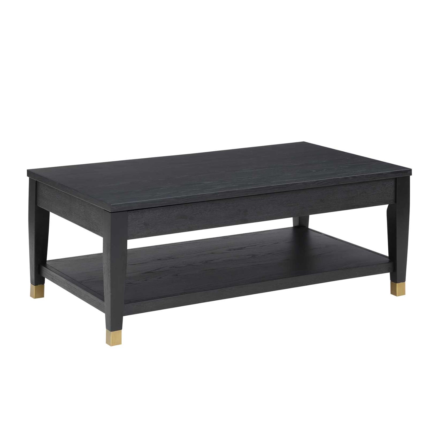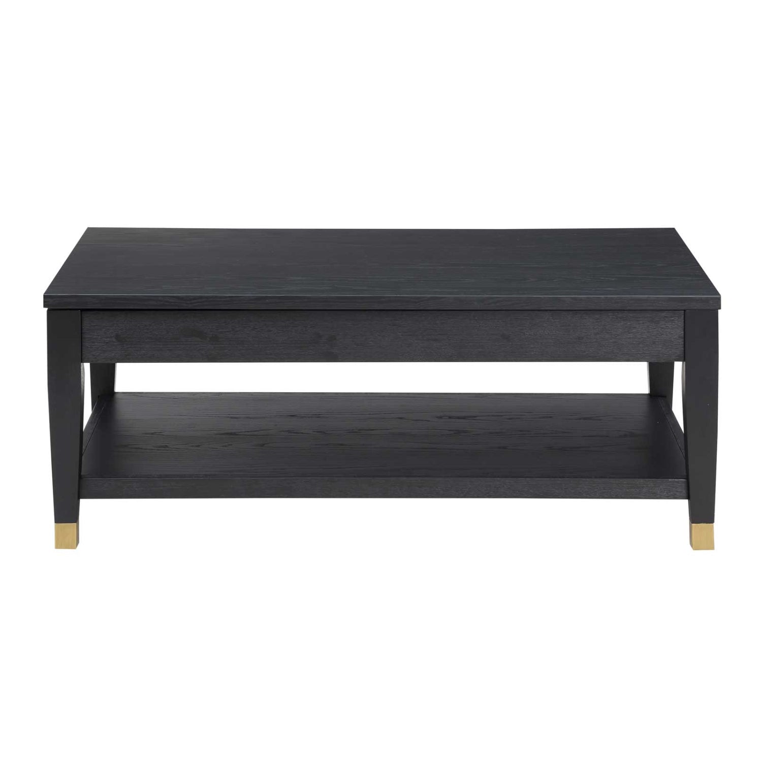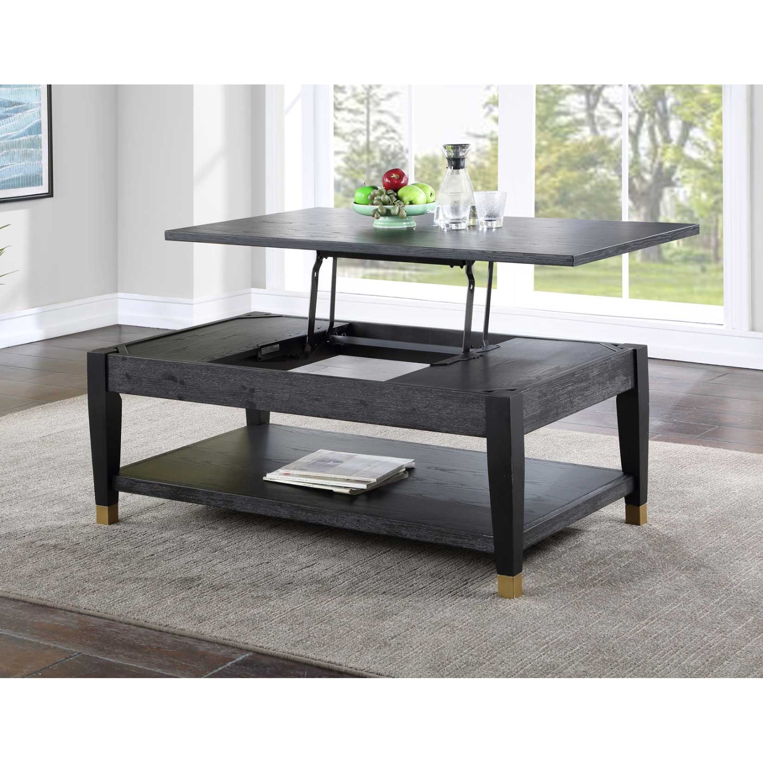 The Yves 48" Coffee Table with Lift Top and Open Shelf by Steve Silver Company - Charcoal effortlessly combines style and functionality, making it the perfect centerpiece for your living room. With its innovative lift-top design, this coffee table allows you to work, dine, or relax comfortably from the couch, enhancing your lounging experience. The elegant Rubbed Charcoal finish, complemented by brushed brass feet, infuses a modern touch to any decor, while offering ample storage space with an open shelf for your books, magazines, or decorative items. Whether you're hosting guests or enjoying a quiet evening, the Yves coffee table is designed to meet your needs with practicality and flair.