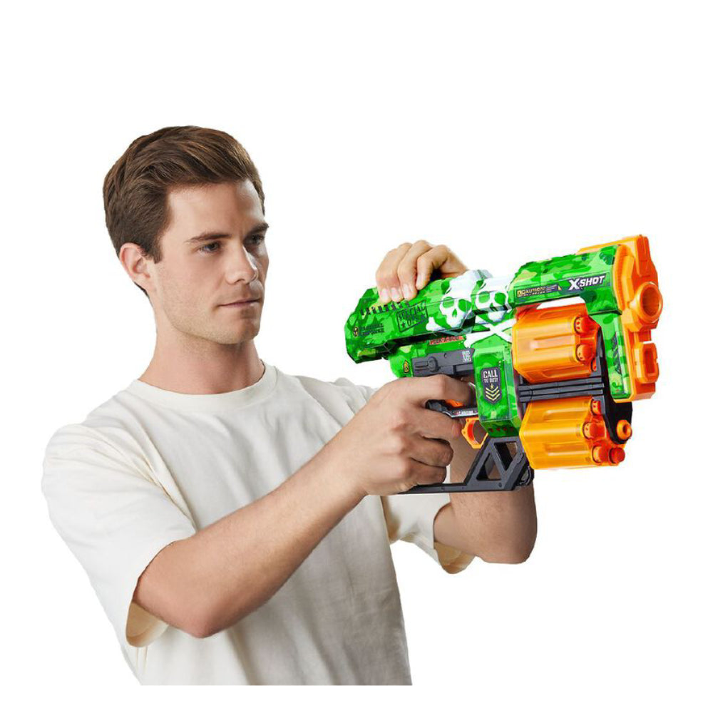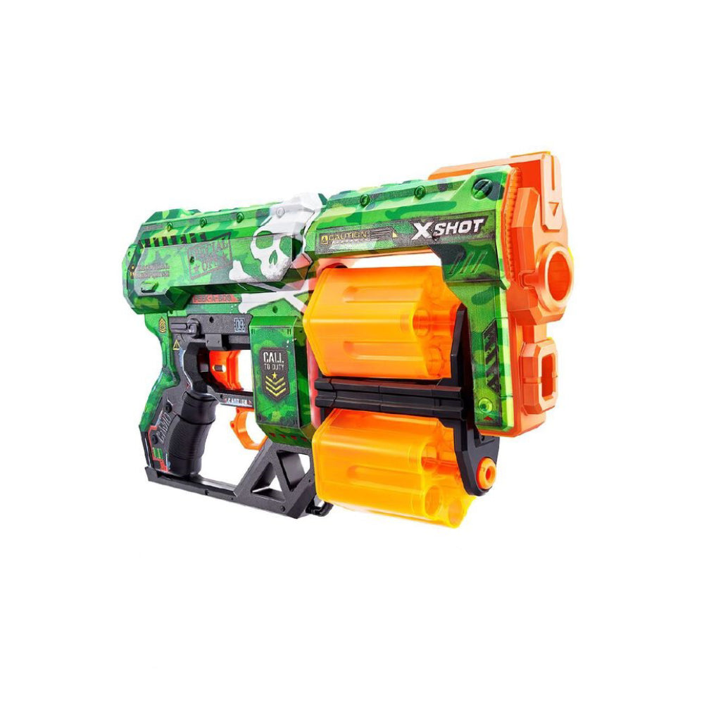 The Zuru X-Shot Skins Dread Assorted, Multicolor takes your blaster experience to the next level by allowing you to customize your in-game appearance with real-life functionality. This innovative blaster features a 12-dart capacity and double trouble-rotating barrels, ensuring you remain locked and loaded for non-stop action. When one barrel runs dry, simply switch to the other and keep the chaos going! With a firing range of up to 27 meters, the Dread blaster is designed for precision and power. Enhanced with air pocket technology, X-Shot Skins darts provide faster, further, and more accurate shots. Furthermore, with seven unique skins to collect, you can build the ultimate armory and stand out in every battle.